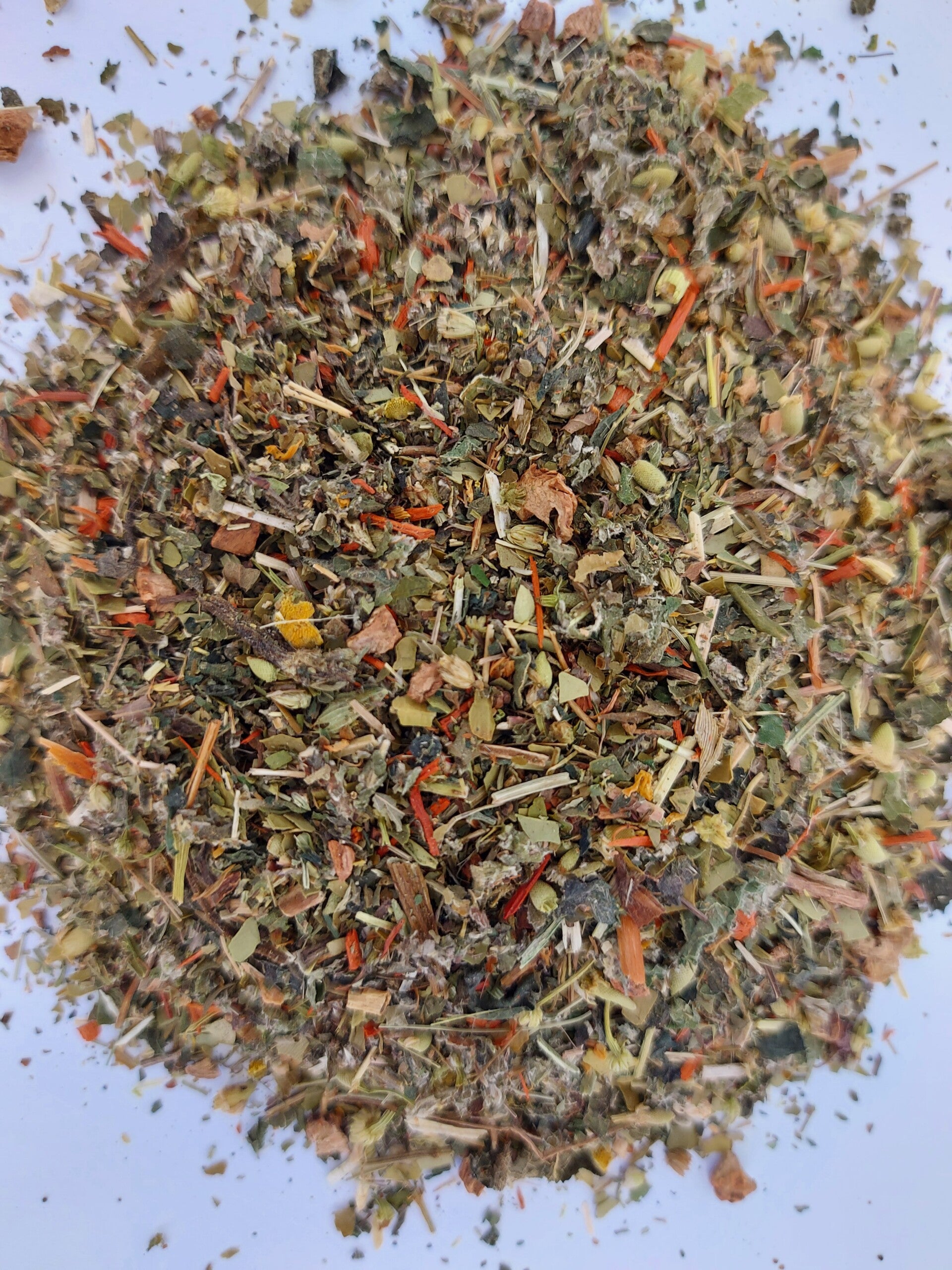 Gewrichtskruiden is een mengsel van Brandnetelblad, maté, sarsaparillawortel, aardbeiblad, duizendblad, st.janskruid, sassafras, frambozenblad, sandelhout, kamille, hysop